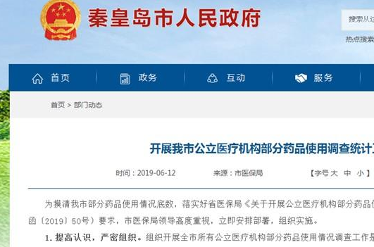 6月12日,秦皇岛市政府网站转发秦皇岛市医保局“开展我市公立医疗机构部分药品使用调查统计工作”的信息。